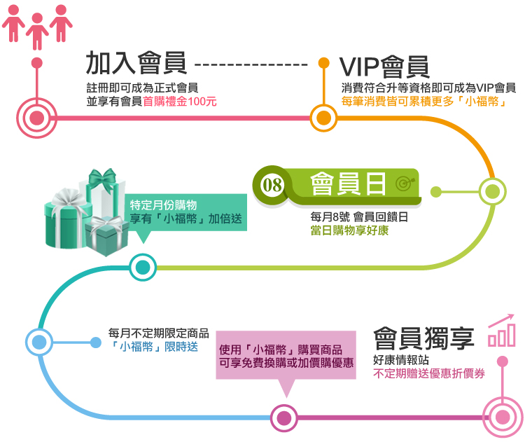 ► 特定月份購物享有「小福幣」加倍送 (依官網公告為準,將不定期舉辦回饋活動,請隨時關注) 。