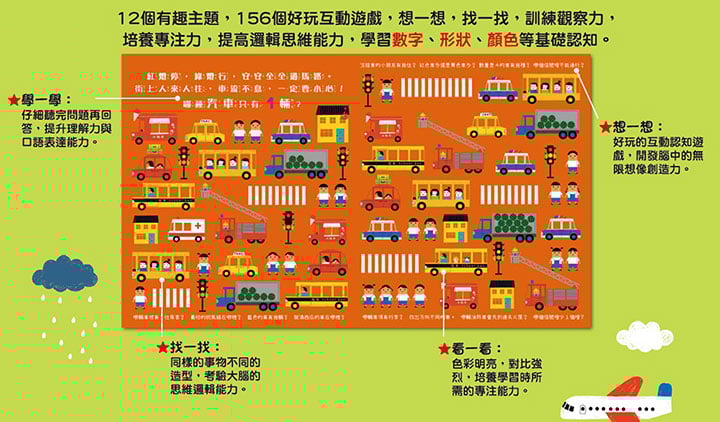 ■商品簡介 156個互動遊戲 等你完成! 本書共12個有趣主題,156個好玩互動遊戲,帶領孩子想一想,找一找,哪種動物或物品「只有一個」?不僅訓練觀察力、培養專注力,更能提高邏輯思維能力,學習數字、形狀、顏色等基礎認知。