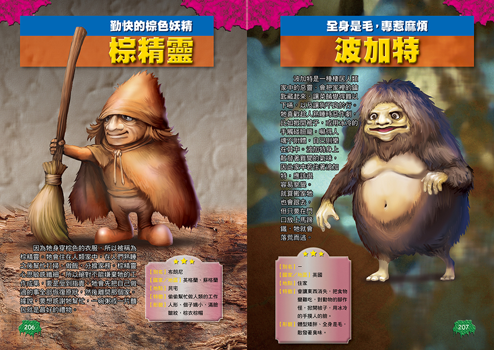 書中依性質將這些神祕存在分為「妖怪與怪物」、「神與神獸」、「惡魔與惡靈」、「妖精與精靈」四大類。除了介紹各種傳說故事,還收錄「科學怪人的誕生」、「製造喪屍的方法」、「女巫的詛咒」等多篇令人驚奇的知識,是一本兼具知識性與趣味性的妖怪圖鑑。