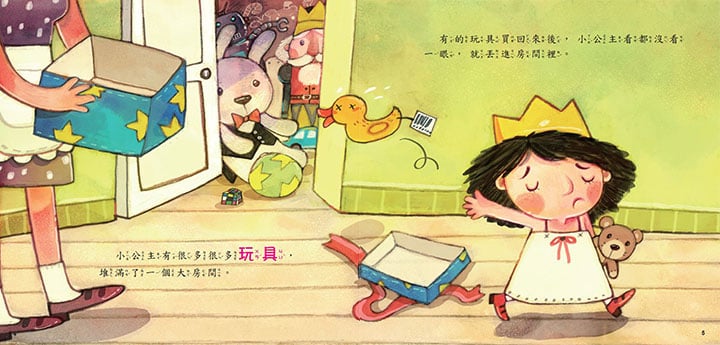 ★《買玩具給我!》 城堡裡的小公主,擁有一整個房間的玩具,可是她還是每天吵著要買新玩具,吵到城堡裡的人都不想靠近她。孤單又無聊的小公主,決定自己去找樂子,沒想到卻遇到許許多多比新玩具更有趣的事物……
