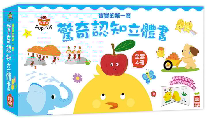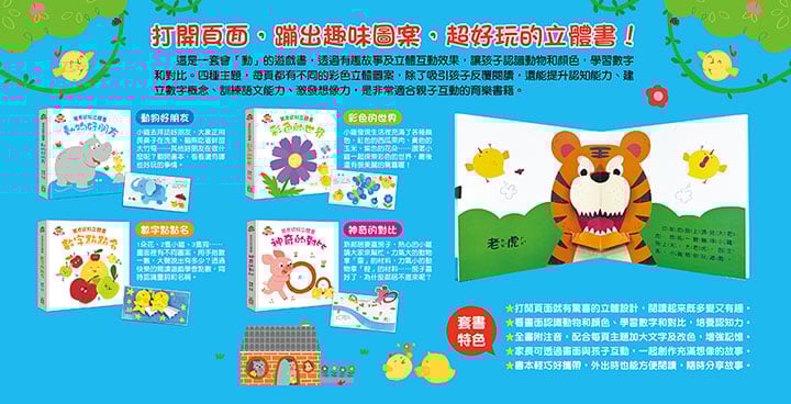 ■商品簡介 打開頁面,蹦出對比圖案,看看哪裡不相同! 這是一套會「動」的遊戲書,共有《動物好朋友》、《數字點點名》、《彩色的世界》、《神奇的對比》四個主題,每頁都有不同的彩色立體圖案,透過有趣故事及立體互動效果,讓孩子認識動物和顏色,學習數字和對比。 以幼兒喜愛及適合的內容來設計故事及畫面,讓孩子跟著主角小雞一起探索世界,邊閱讀邊遊戲,自然而然增加常識及習慣動腦思考與記憶,不論看幾次都有趣。除了吸引孩子反覆閱讀,還可提升認知能力、建立數字概念、訓練語文能力、激發想像力,是非常適合親子互動的育樂書籍。 此外,這套書還有一個好玩的地方──每個跨頁都藏著一隻「小瓢蟲」,快點發揮觀察力把牠找出來,還要說說看牠躲在哪裡? ■內容簡介 《數字點點名》 《彩色的世界》 《神奇的對比》