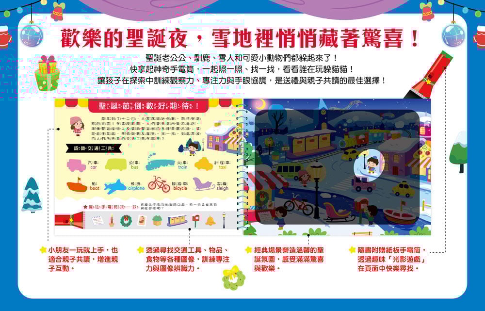 ■商品簡介 照一照、找一找~Bling Bling閃閃亮亮手電筒遊戲書! 快拿起神奇紙板手電筒,照一照閃亮的聖誕場景吧!哇!藏在黑暗中的驚喜圖案就會出現了!在尋找與發現的遊戲過程中,不僅能訓練專注力與觀察力,更能感受滿滿的節慶氛圍與溫馨氣氛,開啟最歡樂、難忘的親子共讀時光。 【內容物】 ◎本產品為紙製遊戲書,請避免拉扯或接觸水氣。