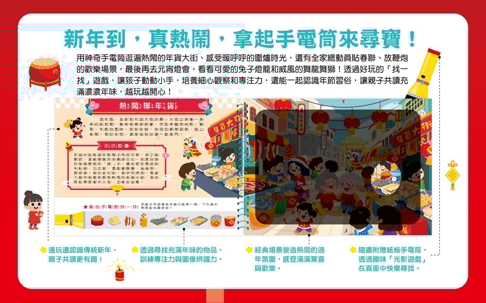 | ■商品簡介 一起熱鬧過新年 拿起手電筒,準備一起探索熱鬧的新年街景吧!結合光影找一找的互動玩法,只要用隨書附贈的紙板手電筒照一照,原本看不見的圖案立刻浮現,移開後又會消失,給孩子帶來驚呼連連的閱讀驚喜。書中以熱鬧的新年場景為主題,融入年節習俗、街市風景與生活認知,在遊戲中培養觀察力、專注力與閱讀興趣,是適合親子共讀的互動遊戲書。 【內容物】 ◎本產品為紙製遊戲書,請避免拉扯或接觸水氣。