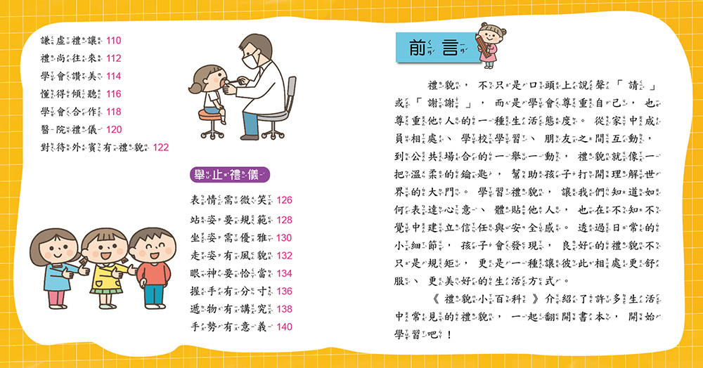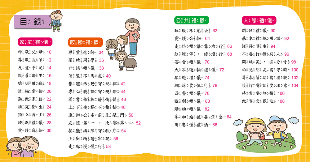 | ■商品簡介 日常生活中處處講究禮貌, 我們的日常生活中時常會遇到需要保持禮貌的情況,如果學會如何按照禮貌行事,就可以讓人際關係、生活與工作都更加順利。你對禮貌的了解有多少呢?你知道凡事要有禮貌聽起來很簡單,其實在各式各樣的場合都有不同的細節要留意嗎?透過書中清晰又鮮豔的圖片、淺顯易懂的文字說明,探索各式各樣禮貌相關知識,並學習如何應用在日常生活中吧!