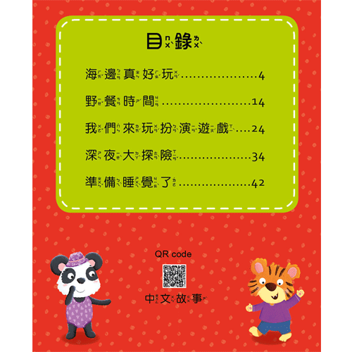 ■商品簡介 \孩子的第一本中英雙語故事/ 掃描QR code,5篇原創故事馬上聽 每天親子共讀3分鐘,培養中文、英語聽讀能力 傑克第一次到海邊玩,心情非常興奮,姊姊拉著他一起去游泳,但是大海看起來太大了,傑克害怕不敢下水。打開書本看一看,之後發生什麼有趣的事呢? 雙封面設計,從正面翻開讀中文故事,從背面翻開讀英語故事,培養孩子閱讀專注力。而聽音、辨音、仿音是所有語言學習的重要基礎,不論是母語或外語都可以從「語音啟發」開始,聆聽故事就是最好的方式,讓孩子奠定好的語感,自然而然引起學習興趣。 從小閱讀故事有助於提高孩子的理解力、想像力和邏輯思維能力,對大腦的發育有很大幫助。親子共讀能增強父母與孩子之間的情感交流,溫暖、好聽的故事情節,能打動孩子的心,讓他們感受到快樂,有助於穩定情緒。 本書特色 ★中英雙語,搭配逗趣主角與色彩繽紛的圖畫,吸引孩子的目光。 ★依據孩子的語言方展階段,規劃故事的內容與文句的難易程度。 ★聘請專業中文與外語老師錄製原創故事,聲音好聽且發音正確。 ★有聲故事以各種音效與襯樂營造情境,沉浸在豐富的聽覺饗宴。
