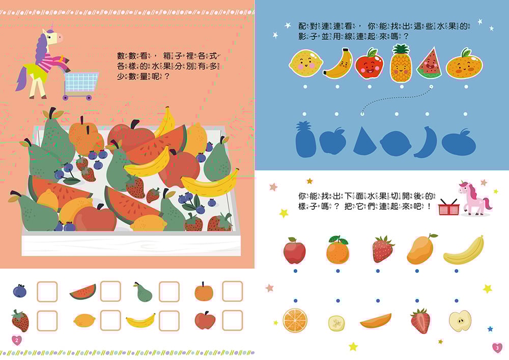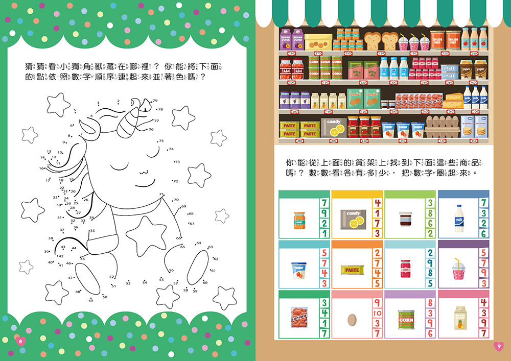 ■商品簡介 小獨角獸,去購物,好熱鬧! 書中有豐富多元、各式各樣的益智小遊戲,從「走迷宮」、「找不同」到「數一數」、「連連看」以及「著色遊戲」,琳瑯滿目的類型引導孩子們的玩樂心與求知慾,從益智遊戲中學習基本認知,提升反應力及思考力,是低幼孩子的最佳啟蒙讀物!