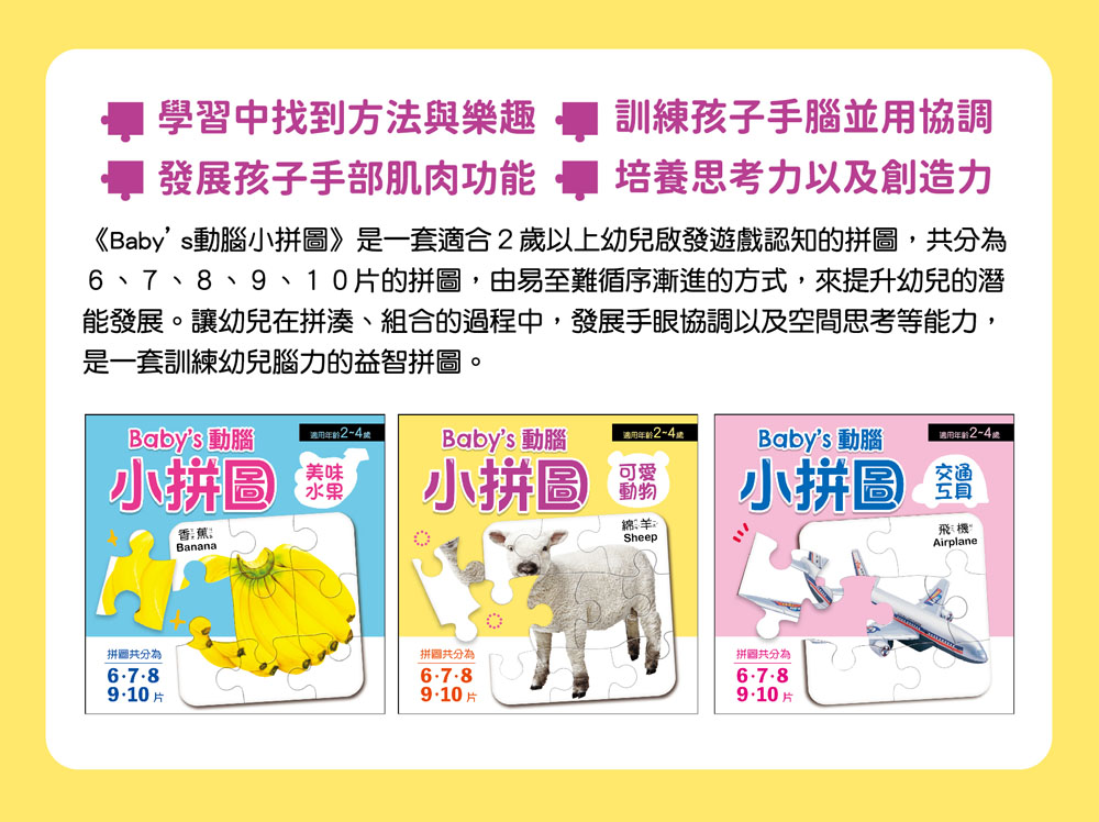 ■商品簡介 動動腦、拼出小小成就感 專為2~4歲幼兒設計的啟發益智遊戲。從6片到10片循序漸進,讓孩子在拼湊過程中觀察、思考、動手完成圖像,訓練專注力與手眼協調,並從中建立信心與成就感。真實色彩圖片搭配中英對照單字,學習自然融入遊戲中,是陪伴孩子快樂成長的最佳啟蒙教材! ◎產品照片因拍攝光線及螢幕顯示設定不同,可能與實品略有色差,請以實際商品顏色為準。