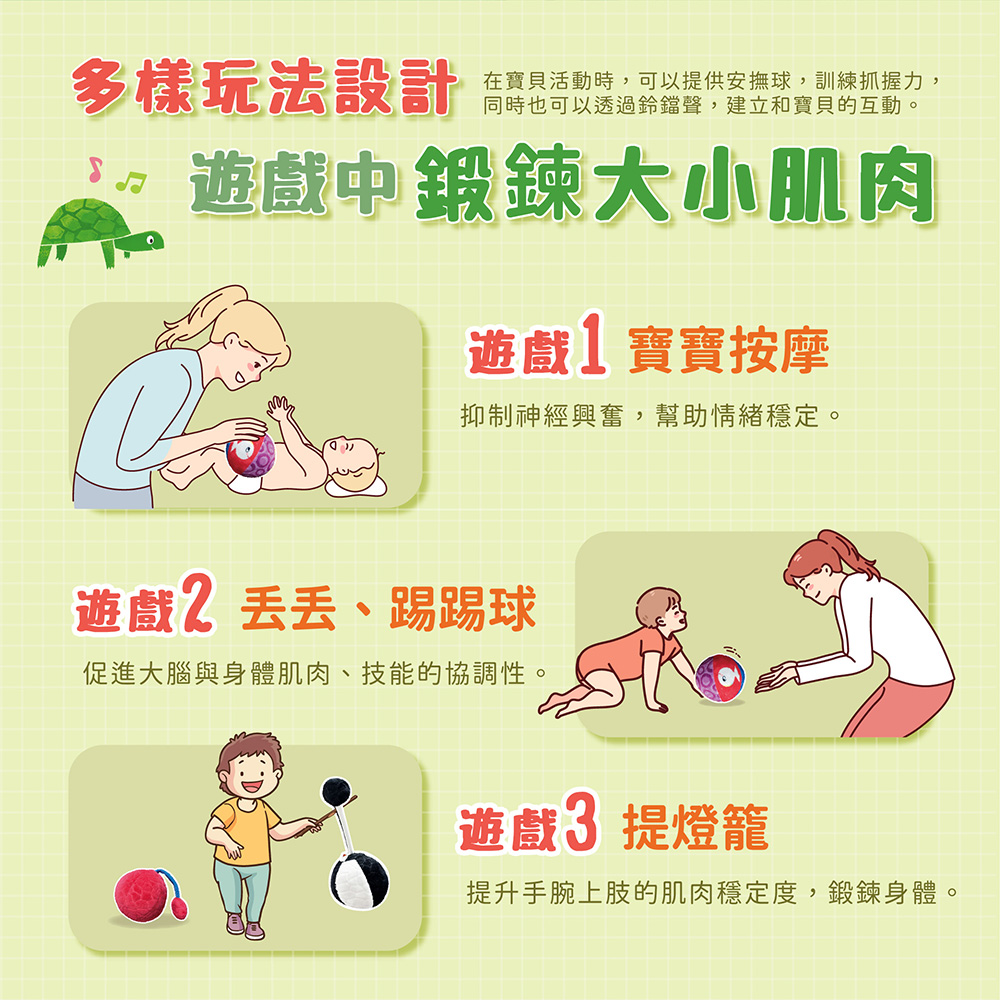 為什麼爸媽都愛這顆球? ★多元感官刺激 視覺(繽紛色彩)+聽覺(柔和鈴聲)+觸覺(多材質設計),一次滿足寶寶探索世界的好奇心。 ★促進大小肌肉發展:揉一揉、抓一抓、丟一丟、踢一踢,在遊戲中自然訓練寶寶的 協調力與專注力。 ★互動玩法超多元:玩中學,學中玩,陪伴寶寶每個成長瞬間。 ★安全材質,安心啃咬:採用 100%聚酯纖維布料,柔軟親膚、無毒安全,寶寶抓握、啃咬也不怕。