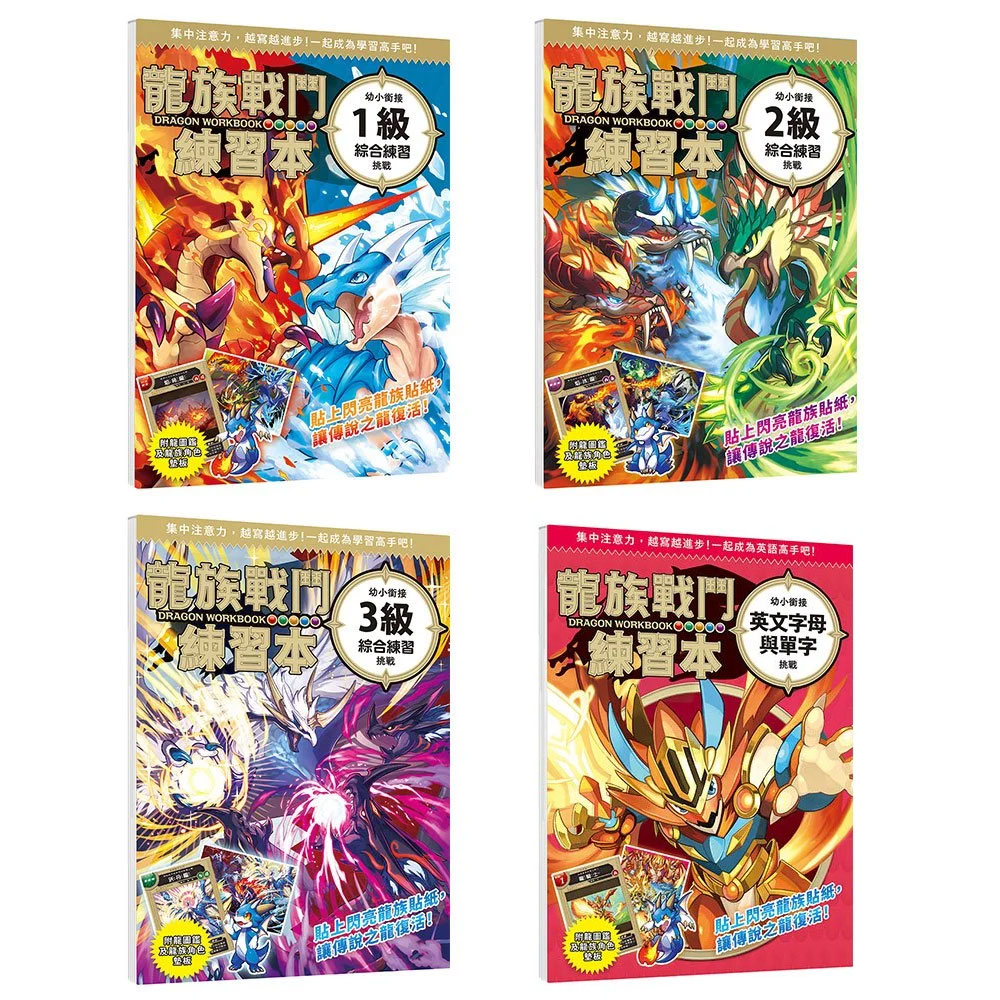 這本書裡封印著五隻使用神聖力量的「 聖龍族」之龍, 每回練習結束,你就能獲得一張閃爍著光芒的龍族召喚貼紙, 請你一格一格解開龍之封印,讓傳說之龍復活!