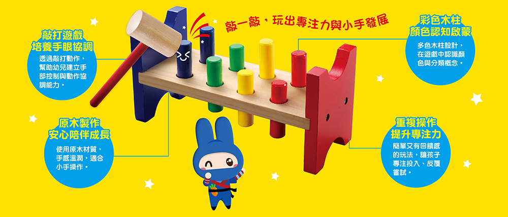 | ■商品簡介 小手敲一敲,玩出靈活手眼協調力 「咚!咚!咚!聽,是什麼好玩的聲音?」 這款專為幼兒設計的「忍者兔歡樂啟蒙原木敲打檯」,是啟蒙階段經典的益智神器!結合豐富的顏色辨識與規律敲擊,讓孩子在充滿節奏感的遊戲中,不知不覺訓練手部肌肉。 配上圓潤的彩色木柱,讓孩子在一次次的精準敲擊中,建立滿滿的成就感與自信心。這不僅是好玩的玩具,更是陪伴寶貝發展專注力與手眼協調的最佳夥伴! ◎木製玩具建議存放於乾燥通風處,避免直接日曬或放置於潮濕環境。