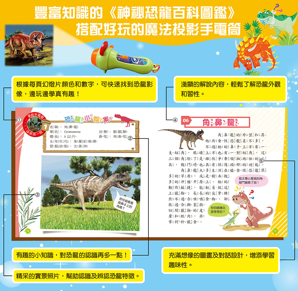 【遊戲配件】 1.108頁精裝百科圖鑑。 2.1支魔法投影手電筒。 3.6組幻燈片,共有48張恐龍影像。 4.1條手電筒吊繩。