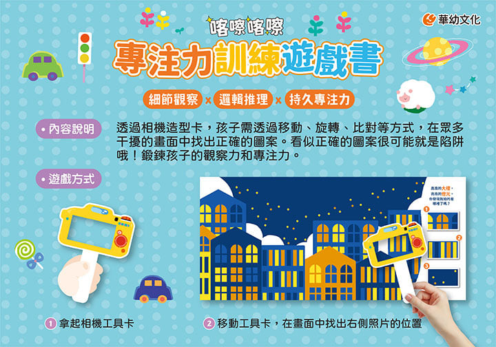 | ■商品簡介 細節觀察x邏輯推理x圖像比較 本書附一個相機造型工具卡,孩子需要透過移動、旋轉、比對等方式,在眾多干擾的畫面中找出正確的圖案。不只能培養孩子的專注力,還能鍛鍊觀察力、邏輯思維和推理能力!