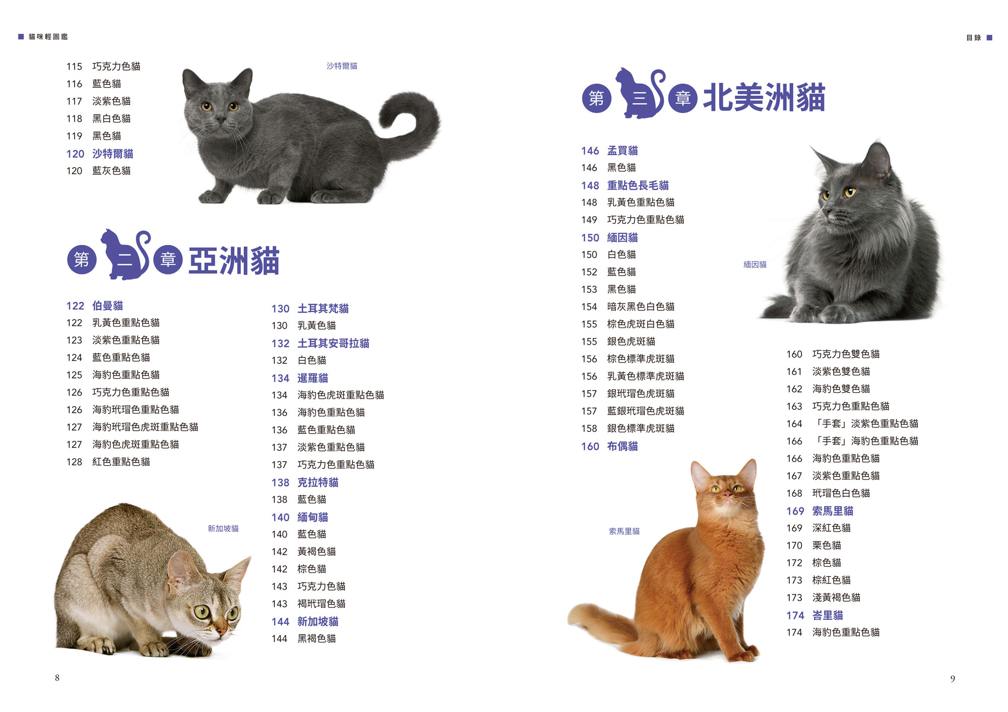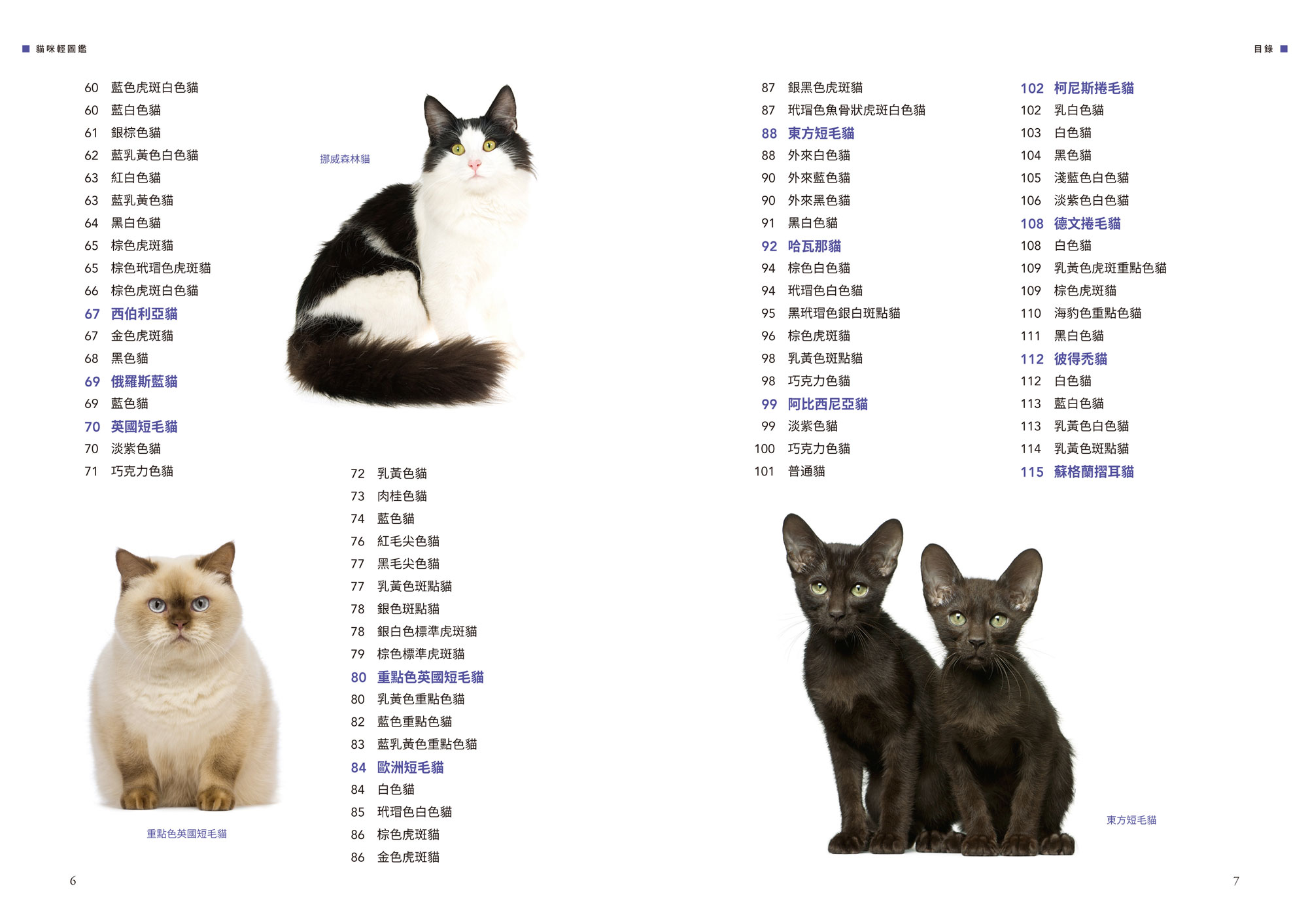 第一章 歐洲貓 波斯長毛貓 挪威森林貓 西伯利亞貓 俄羅斯藍貓 英國短毛貓 重點色英國短毛貓 歐洲短毛貓 東方短毛貓 哈瓦那貓 阿比西尼亞貓 柯尼斯捲毛貓 德文捲毛貓 彼得秃貓 蘇格蘭摺耳貓 沙特爾貓