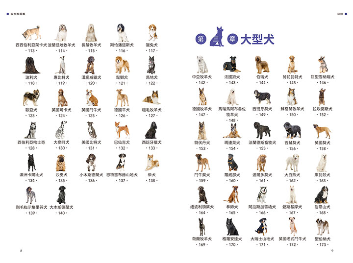 第三章 大型犬 中亞牧羊犬 法國狼犬 伯瑞犬 荷花瓦特犬 巨型雪納瑞犬 德國牧羊犬 馬瑞馬阿布魯佐牧羊犬 西班牙獒犬 蘇格蘭牧羊犬 拉坎諾斯犬 特伏丹犬 瑪連萊犬 法蘭德斯畜牧犬 西藏獒犬 英國獒犬 鬥牛獒犬 羅威那犬 波爾多獒犬 大白熊犬 庫瓦茲犬 紐波利頓獒犬 拳師犬 阿拉斯加雪橇犬 愛斯基摩犬 伯恩山犬 荷蘭牧羊犬 格羅安達犬 大瑞士山地犬 英國老式鬥牛犬 聖伯納犬 土佐犬 大丹犬 蘭伯格犬 捲毛尋回犬 美國鬥牛犬 英國雪達犬 平毛尋回犬 戈登雪達犬 英國指示犬 德國剛毛指示犬 荷蘭山鶉獵犬 馬士提夫犬 愛爾蘭紅白雪達犬 奧貝紐指示犬 匈牙利短毛指示犬 阿根廷杜告犬 英國獵狐犬 西班牙靈緹 獵鹿犬 靈緹 愛爾蘭獵狼犬 尋血獵犬 法老王獵犬 伊比莎獵犬 薩路基獵犬 俄羅斯獵狼犬 阿富汗獵犬 蘭西爾犬 羅德西亞背脊犬 秋田犬 杜賓犬 紐芬蘭犬