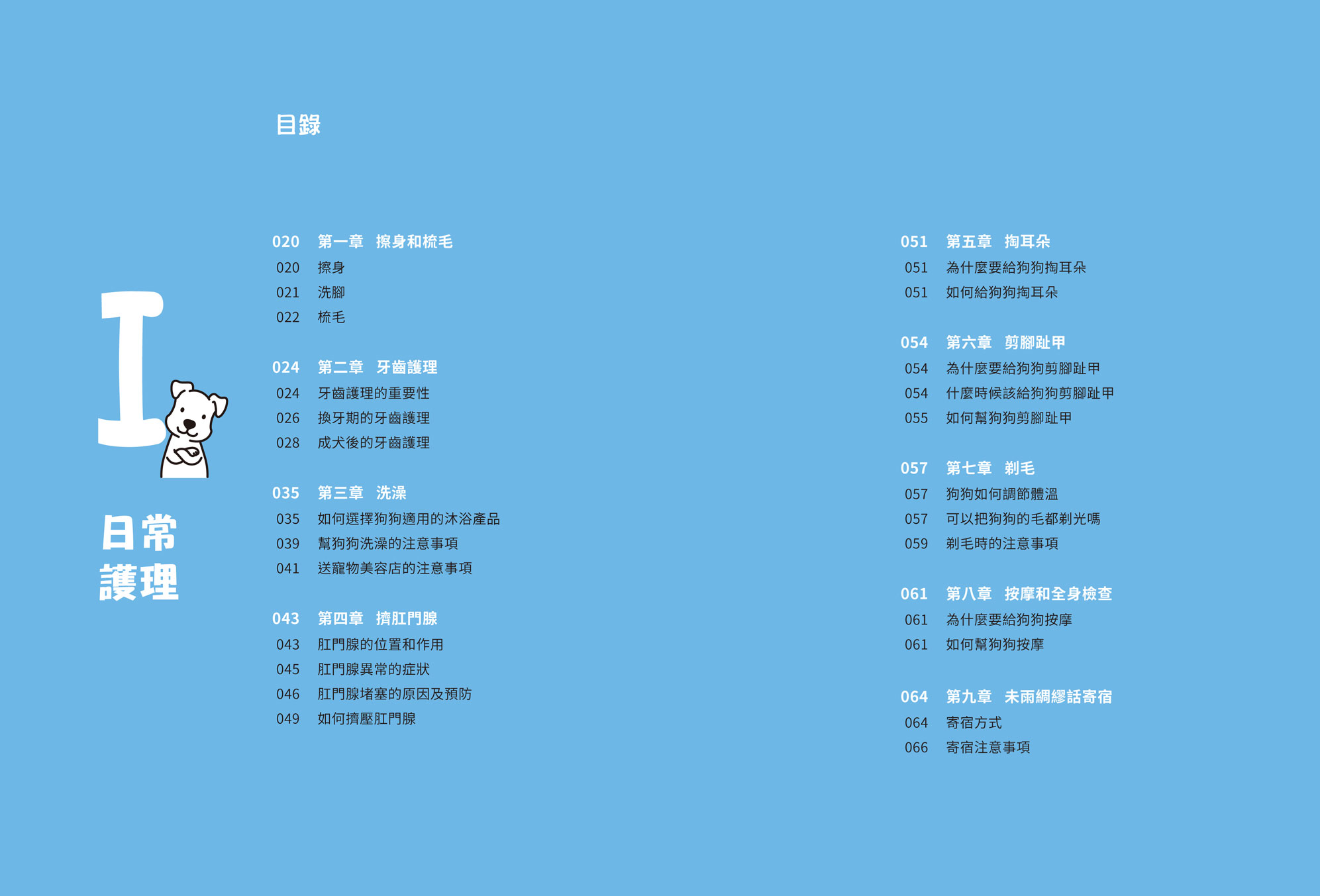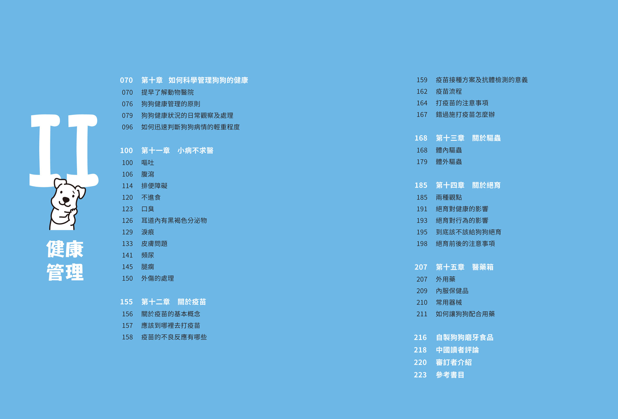 其他還有很多養狗達人的經驗之談, 有圖有文,方便對照參閱, 讓你成為毛孩最信任、最可靠的家長, 照顧家裡的寶貝健健康康直到天年。