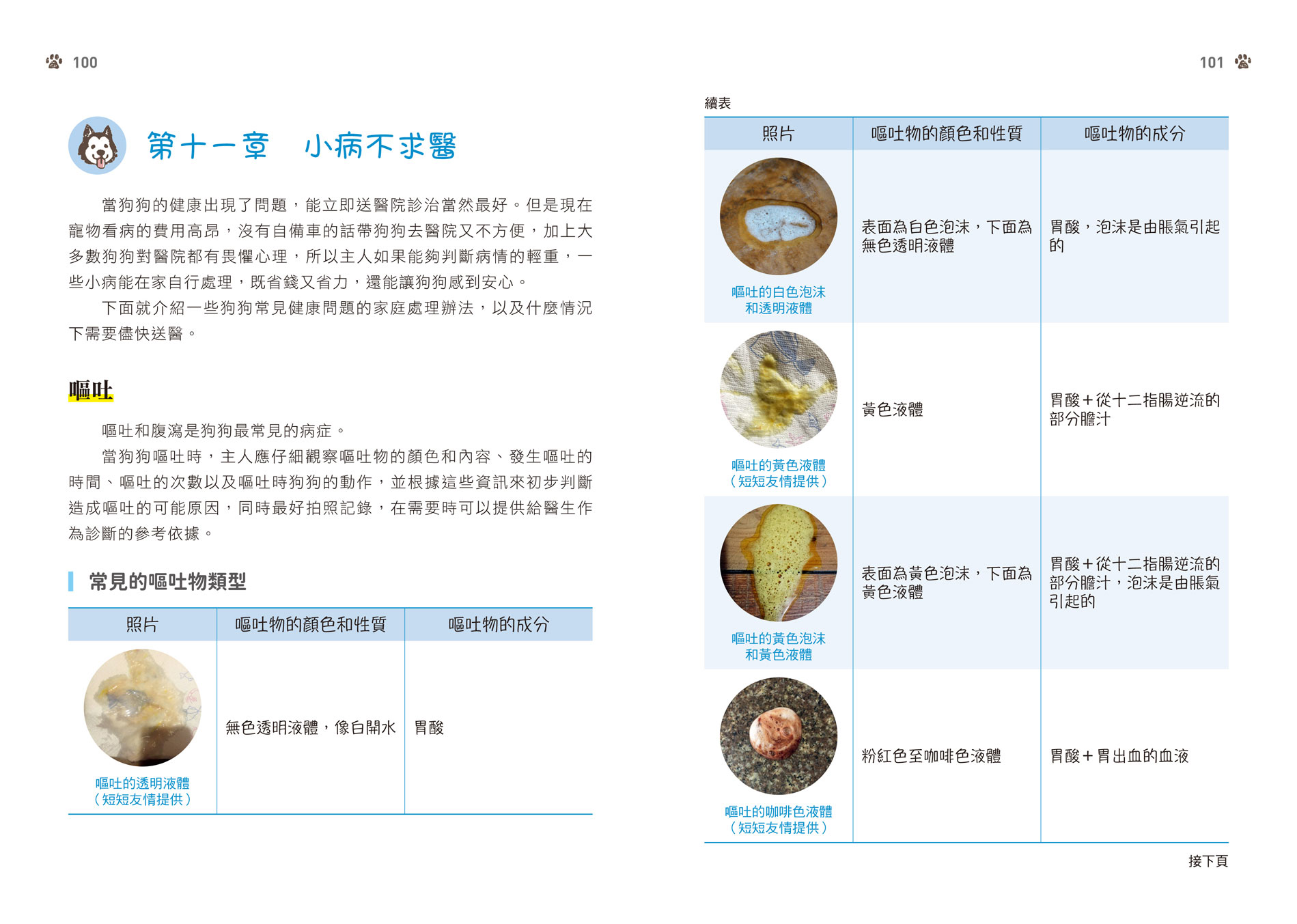 有了基礎知識,在狗狗不舒服時,更容易判斷該採取哪些行動。 例如—— 狀況一:狗狗吐了,哪些情況要立刻送醫?哪些時候可以先在家觀察? 狀況二:狗狗落賽,便便居然是綠色的!要緊嗎?我該馬上拎牠去醫院嗎? 狀況三:狗狗不肯吃飯,是身體不舒服還是挑食?要怎麼觀察? 狀況四:小奶狗流清鼻涕,該先觀察,還是直接送醫? 狀況五:狗狗突然掰咖!是被玻璃扎傷還是骨折? 狀況六:狗狗一直用腳撥眼睛,是怎麼了? 狀況七:狗狗打架互咬!外表沒有大傷口,牠卻一直發抖,怎麼辦?