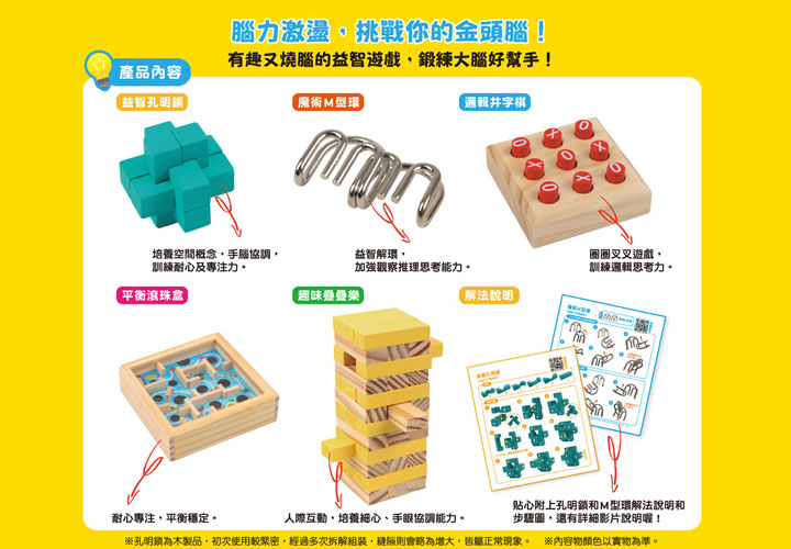 ■商品簡介 腦力激盪,挑戰你的金頭腦! 有趣又燒腦的益智遊戲, 鍛練大腦的好幫手! 孔明鎖xM型環x井字棋x滾珠盒x疊疊樂