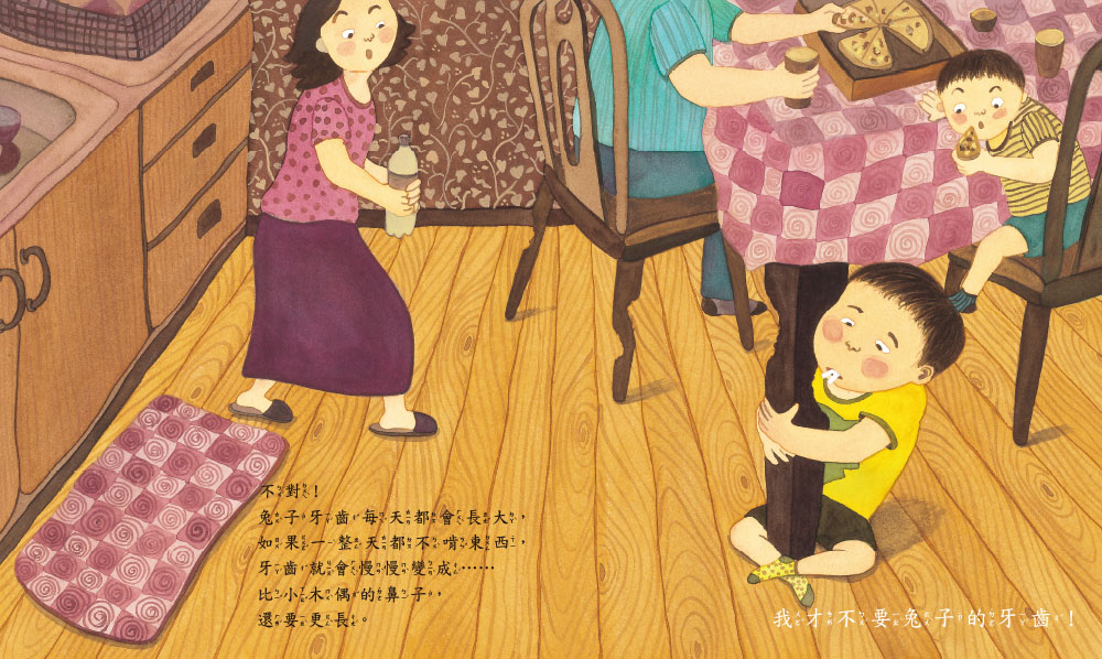我的門牙掉了,何時才會長出新牙齒呢? 會長出和兔子一樣的牙齒嗎? 兔子的牙齒很棒,又白又長還可以咬斷任何東西。 不過兔子不啃東西,牙齒就會不斷變長,像小木偶的鼻子一樣!