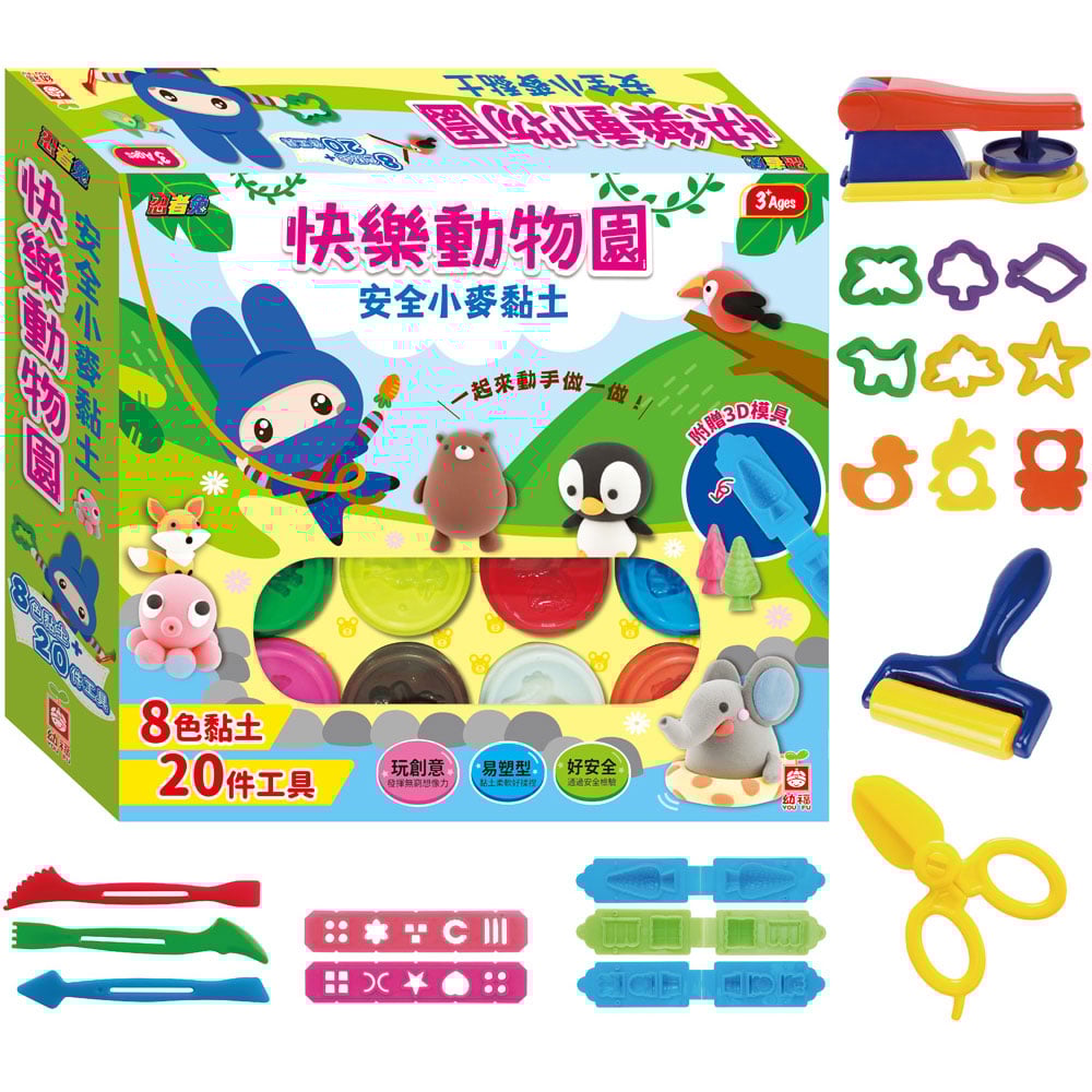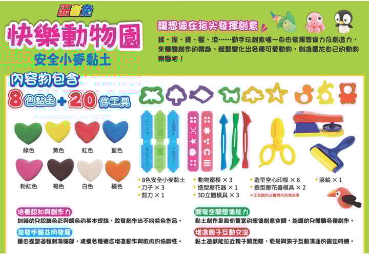 內容物: ▲8色小麥黏土:紅色、黃色、藍色、綠色、白色、橙色、咖啡色、粉紅色(上蓋附模型) ▲20件模具:動物壓模 × 3、造型空心印模 × 6、滾輪 × 1、刀子 × 3、造型壓花器 × 1、造型壓花器模具 × 2、剪刀 × 1、3D立體模具 × 3 ▲示範說明書