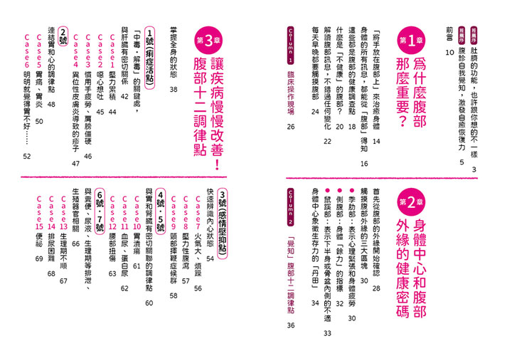 本書透過腹部十二個不同的點位,帶領讀者仔細解讀腹部的訊息,並設計按摩及身體伸展的動作,來疏通這十二個點位的柔軟度,達到改善身體不適、日常保健的效果。