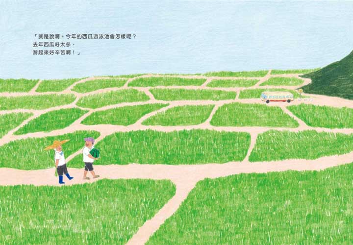 一向安靜的村莊頓時喧嘩了起來。大家開心的往西瓜游泳池跑去,孩子們呼朋引伴,在泳池裡嬉鬧,西瓜皮變成了眾人的溜滑梯,西瓜葉是大家最愛的跳水板,有藝術天分的孩子則利用西瓜籽和果肉刻出成各式各樣的雕像……這般歡樂的景象,連老爺爺老奶奶也忍不住加入孩子的遊戲行列……