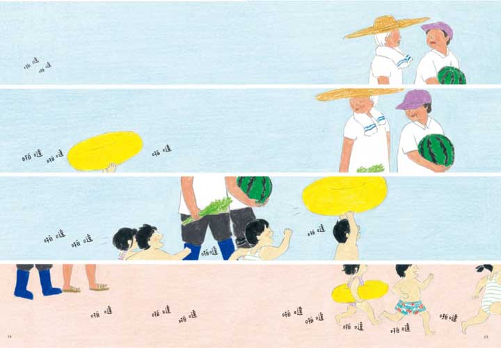 炎炎夏日,老爺爺發現了裂成兩半的大西瓜……哇,得趕緊告訴村裡的男女老幼:清清涼涼的西瓜游泳池開放啦。