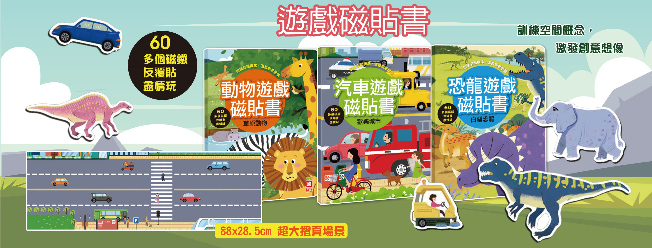 | ■商品簡介 訓練空間概念,激發創意想像 88 x 28.5 cm超大場景 反覆貼 盡情玩 內附超過60個磁鐵,先認識這些動物、車輛、恐龍